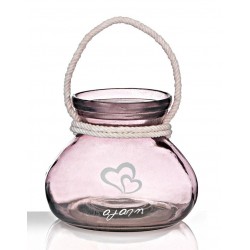 διάφανο κηροπήγιο με ανάγλυφη καρδιά, διακοσμημένο με κορδόνι λινάτσα.